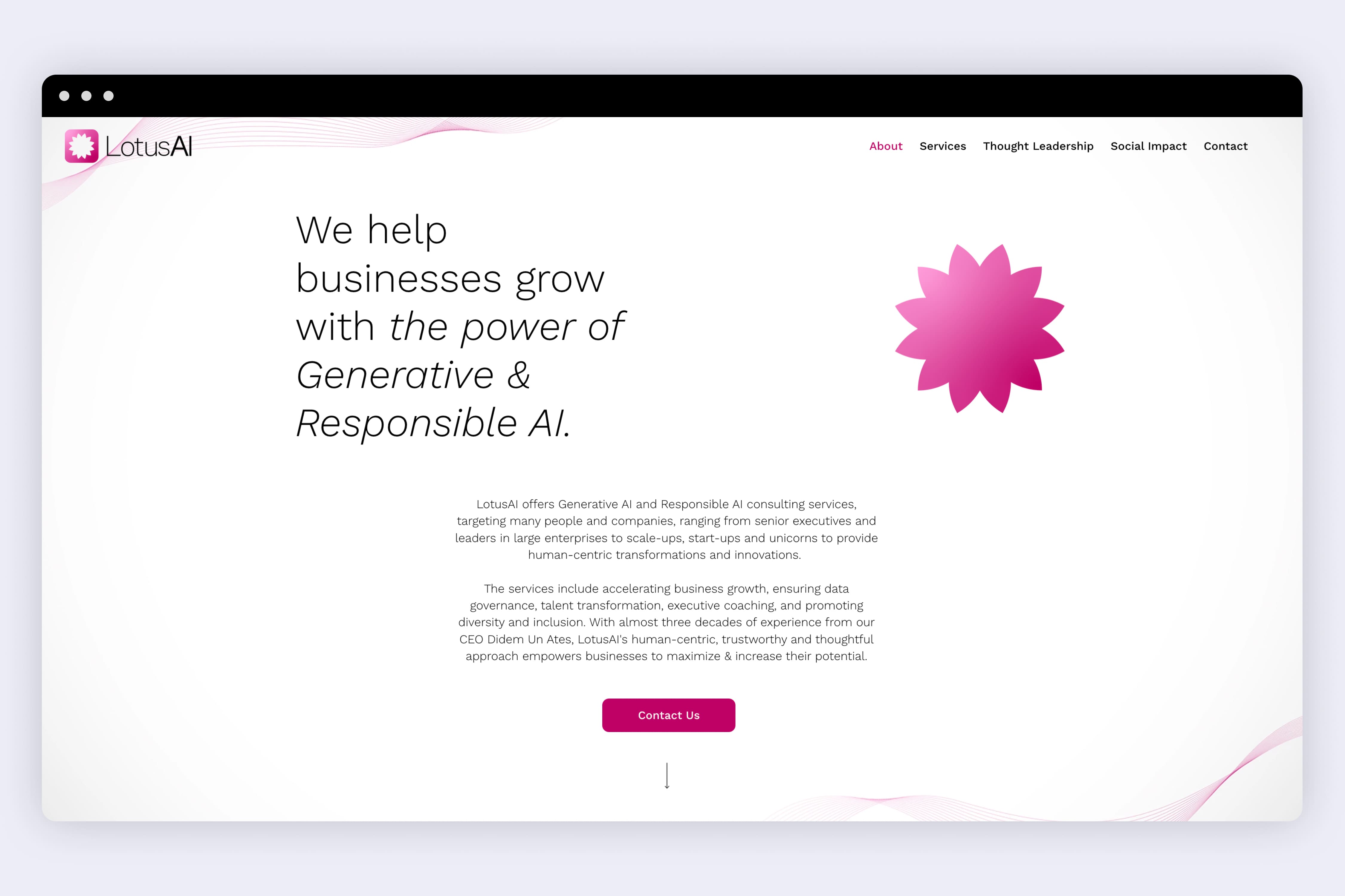Lotus AI is a consulting firm specializing in Generative AI and Responsible AI transformation. Founded by a leader with over two decades of experience at global institutions such as Microsoft and Goldman Sachs, the company works with a wide range of clients, from senior executives in large enterprises to scale-ups, start-ups, and emerging tech companies. During the early stages of launching the firm, we collaborated closely with the founder to define the brand’s strategic foundation and create a visual and structural system that would support both technological innovation and socially responsible transformation initiatives.